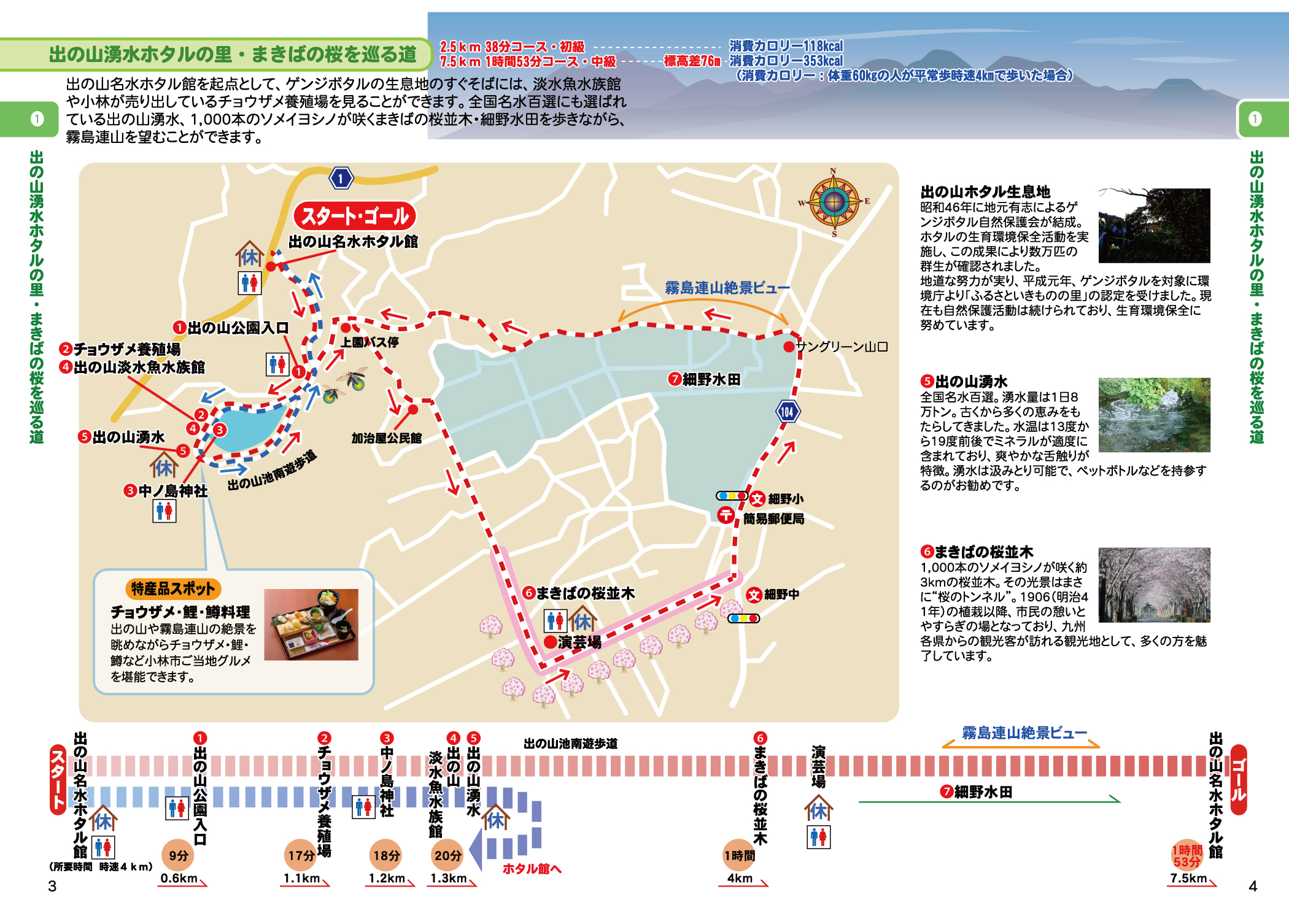全国名水百選にも選ばれている出の山湧水、1,000本のソメイヨシノが咲くまきばの桜並木・細野水田を歩きながら、霧島連山を望むことができます。